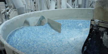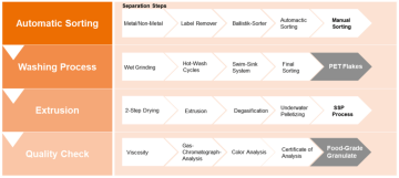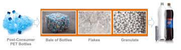 Po důkladném vymytí stlačených PET lahví následuje jejich rozdrcení do podoby vloček. Ty pak prochází několika třídícími stroji rozeznávajícími barvu a materiál a zaručujícími, že k dalšímu zpracování neprojde jiná surovina, než je PET nebo PET v barvě nevhodné pro recyklaci.