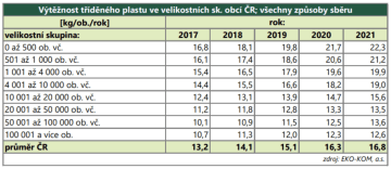 Výrazně se liší vytříděné množství na obyvatele ve vztahu k velikosti obce. S rostoucí velikostí se snižuje vytříděné množství na jednoho občana.