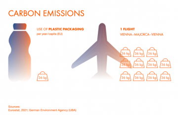 Fakt: Plastové obaly představují jen 0,5 % uhlíkové stopy průměrného Evropana. Například zpáteční let mezi Vídní a Mallorkou vyprodukuje stejné množství CO2 jako 11 let používání plastových obalů.