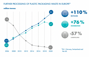 Fakt: V Evropě se stále více plastů recykluje a skládkování se neustále snižuje. Od roku 2006 vzrostlo recyklování plastů o 110 %, zatímco skládkování kleslo o 57 %.