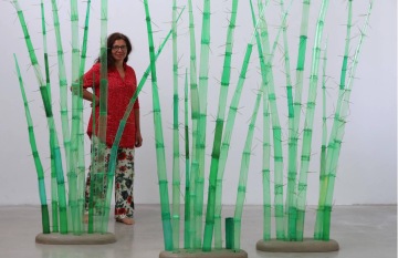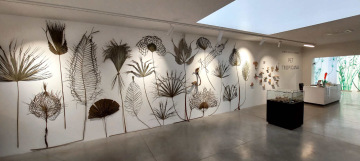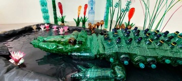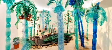 V Tišnově probíhá až do 2.10. v krásné, moderní Galerii Josefa Jambora výstava PET TROPICANA 2.0. Navazuje na mou stejnojmennou výstavu z roku 2010 skleníku Fata Morgana v Botanické zahradě v Praze. Téma zůstává, ale exponáty se proměnily. Chci ukázat, kam jsem se za ta léta posunula. Tenkrát jsem ve skleníku vystavovala výhradně díla inspirovaná rostlinnou a živočišnou říší. Dnes už zvířata, až na výjimky, nedělám. Zato se mi rozkošatil repertoár různých palem, stromů, květin, lián, které zhmotňují mou fascinaci tropickými kraji. Na výstavě ale najdete i třeba černošský trůn s kostýmy pro tanečníky, tropický obchůdek, kreace z palmového listí nebo dary moře, což jsou drobné objekty vytvořené z naplavenin. Pet lahve ale samo sebou převládají. V zahradě stojí PBC- PlasticBottleCabin, domek z palet a pet lahví, jehož posláním je mimo jiné zužitkování pet lahví v zemích, kde nefunguje jejich svoz a recyklace.